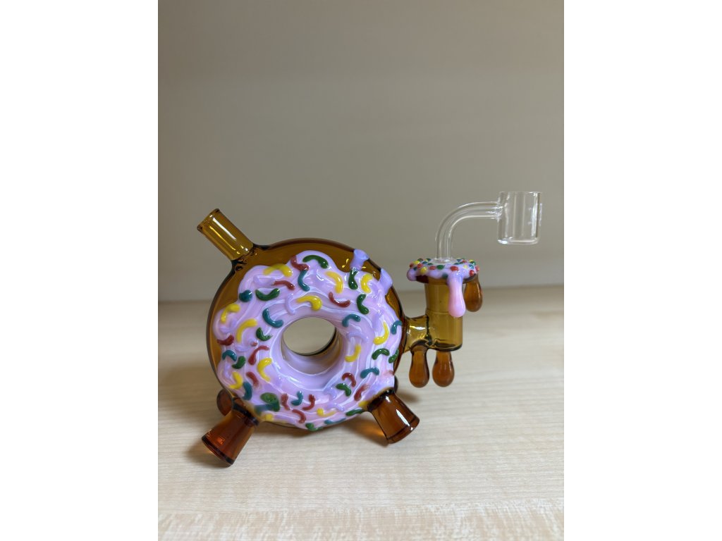 Otvor v donutu dělá tento dab rig velmi praktickým. Pálka s 14mm NS se nejprve zahřeje na spodní straně, poté se do pálky přidá kalafuna, vosk atd. Jakmile se vyvine kouř, můžete začít kouřit. Pro maximalizaci produkce kouře doporučujeme použít uzávěr karburátoru